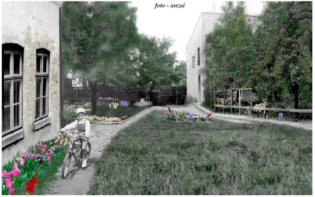 UsuńNa rowerku to mój młodszy kuzyn (niestety Rawiczek po kądzieli). Nie wycinałem go, ani nie barwiłem, bo chodziło o punkt skalowania dla wszystkich części obrazu. To jest podwórko łączące oba ogrody i dzielące rodzinę.